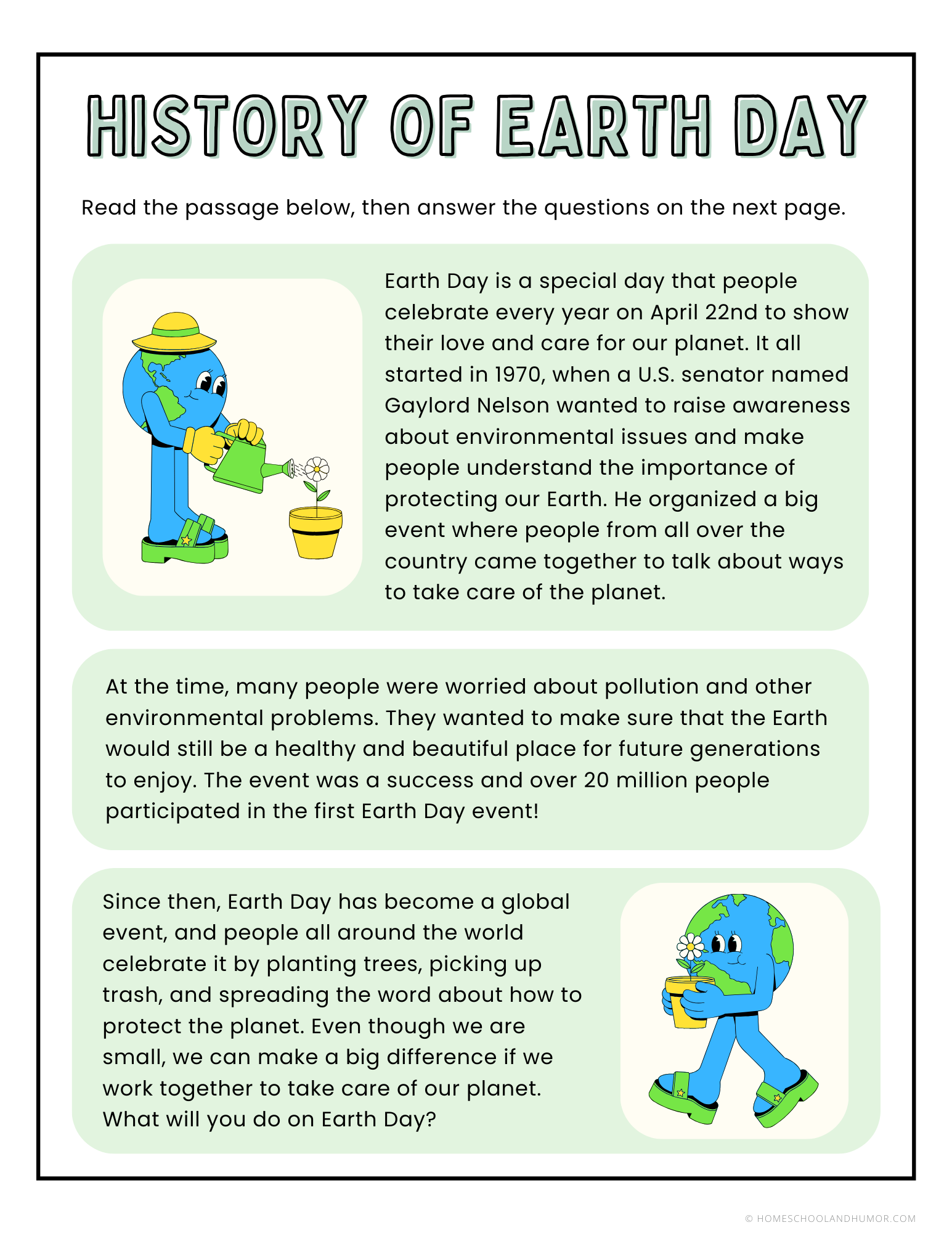 📖 Reading Comprehension & Writing Prompts – Explore Earth Day’s history and its impact through engaging stories and thought-provoking questions.